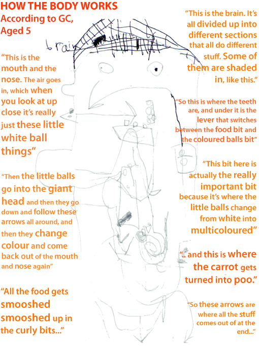 This week, for example, having just returned from a trip to Italy to visit his grandparents, GC arrived at the lesson enthused about a programme he had watched on Italian TV which had explained in some depth the internal workings of the human body. Keen to impart this wondrous new knowledge to me, he then set about recreating the relevant diagrams, accompanied by an excellently remembered (and translated) verbal explanation of what the process involved. It went like this: